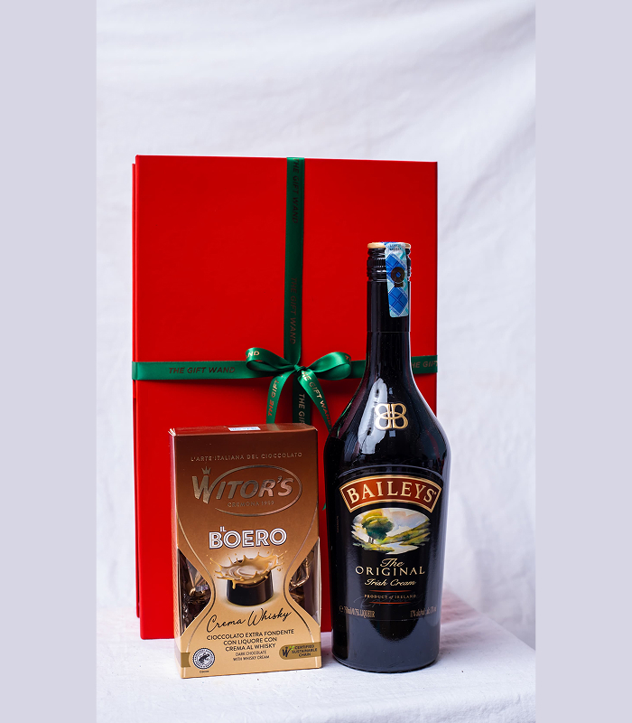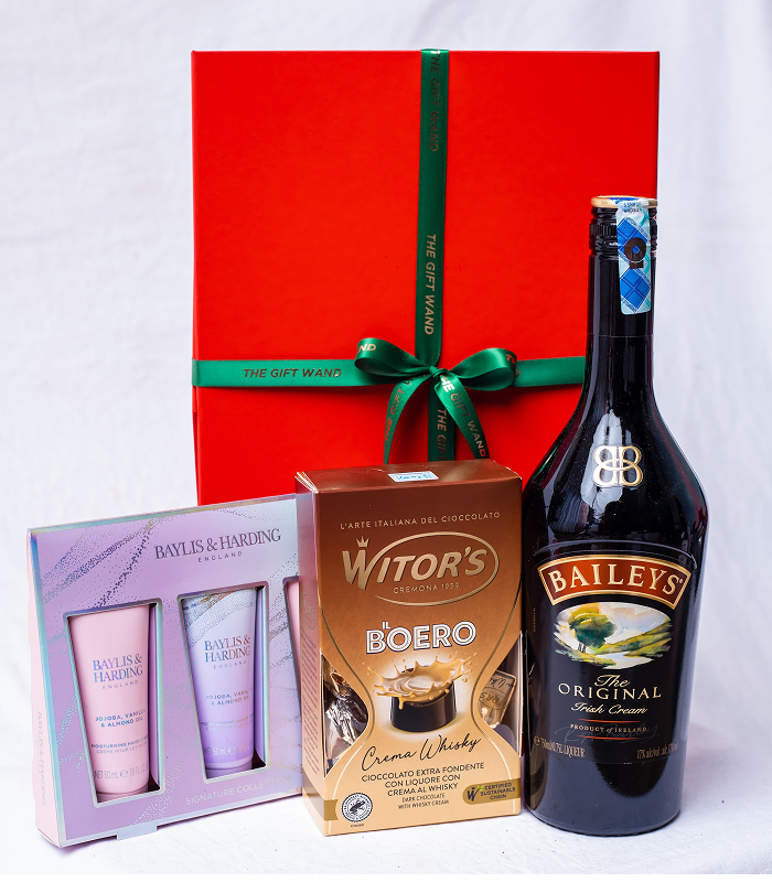 Wrapped :- Baileys Irish cream Liquer 750 ml -Wiltors Chocolates -Royale Garden Roses hand creams -3pcs @ 30ml -Gift Box - Ideal for Birthdays, anniversaries, and “just because” moments
