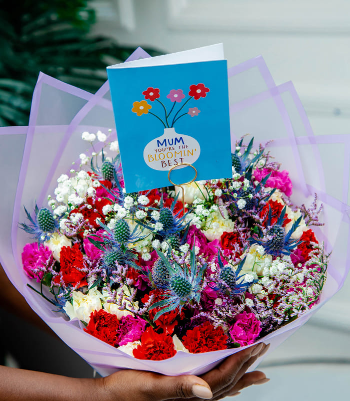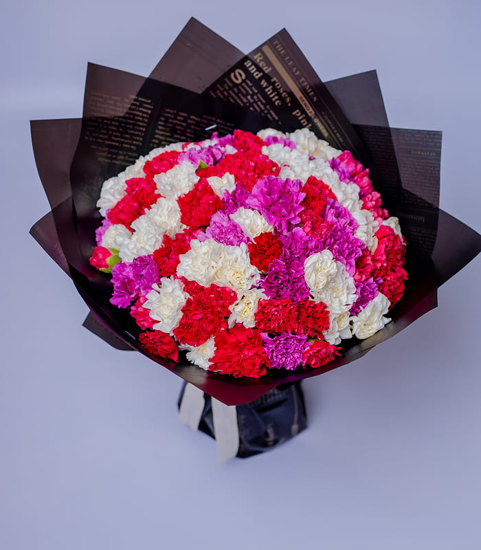 Wrapped - 10Stems of Red carnations -10 stems of pink carnatons -10 Stems of whites carations -5 Stems of Erygium-5 Stems of Gypsophila -5 Stems of Limonium -Ideal for Romantic gestures – especially the kind that say “I admire you deeply, but I also respect and care for you.”