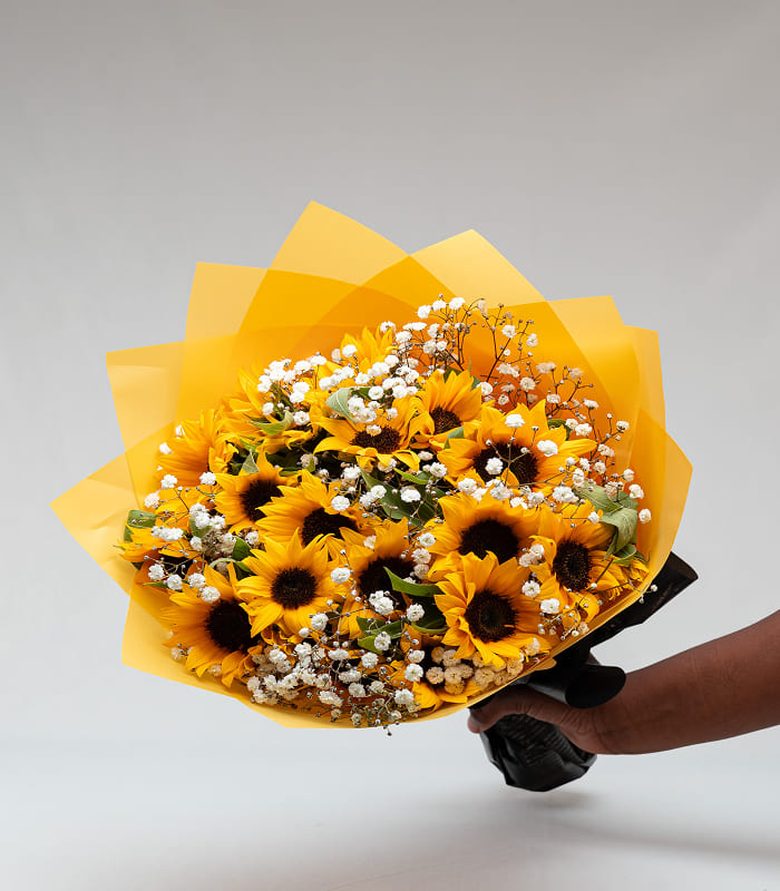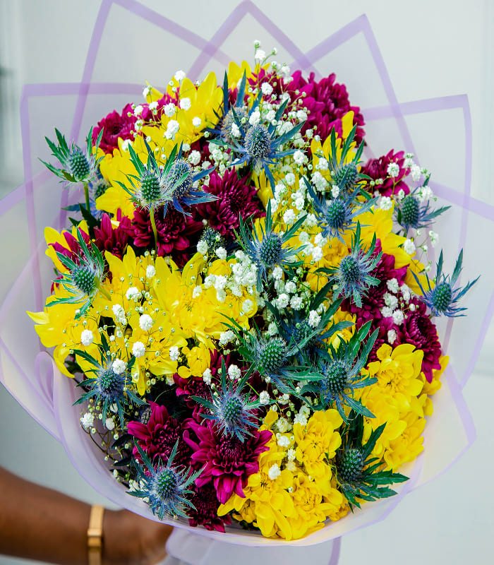 Wrapped:-5stems of Purple chrysanthemums -5 stems of Yellow chrysanthemums -5 stes or Erygium -5 Stems of Babys breathe -Ideal for • Gifting someone with unique taste.